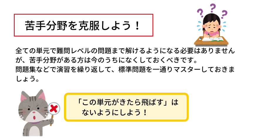 どの単元も応用レベルの問題まで解けるようになる必要はありませんが、苦手な単元がある場合は問題集等で演習を繰り返し、定型問題を一通りマスターしましょう。