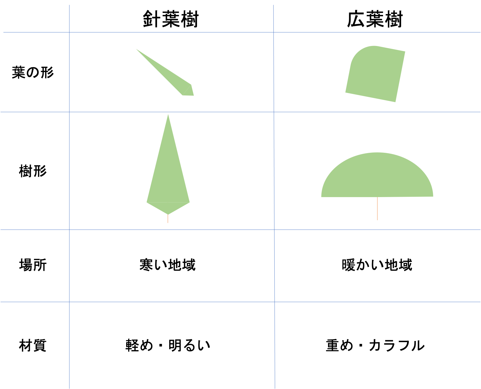 まず,すべての樹木は針葉樹か広葉樹に分けられます。針葉樹とはその名の通り葉っぱの形が針のように細いもの,広葉樹は葉っぱの形が広いものになります。その他の違いだと,木の形が円すいのようにとがったものになるのが針葉樹,丸みを帯びたものになるのが広葉樹になります。その他の材質でいうと,軽めなのが針葉樹・重めなのが広葉樹です。これらの特徴をまとめると,次のような表に整理できます。
