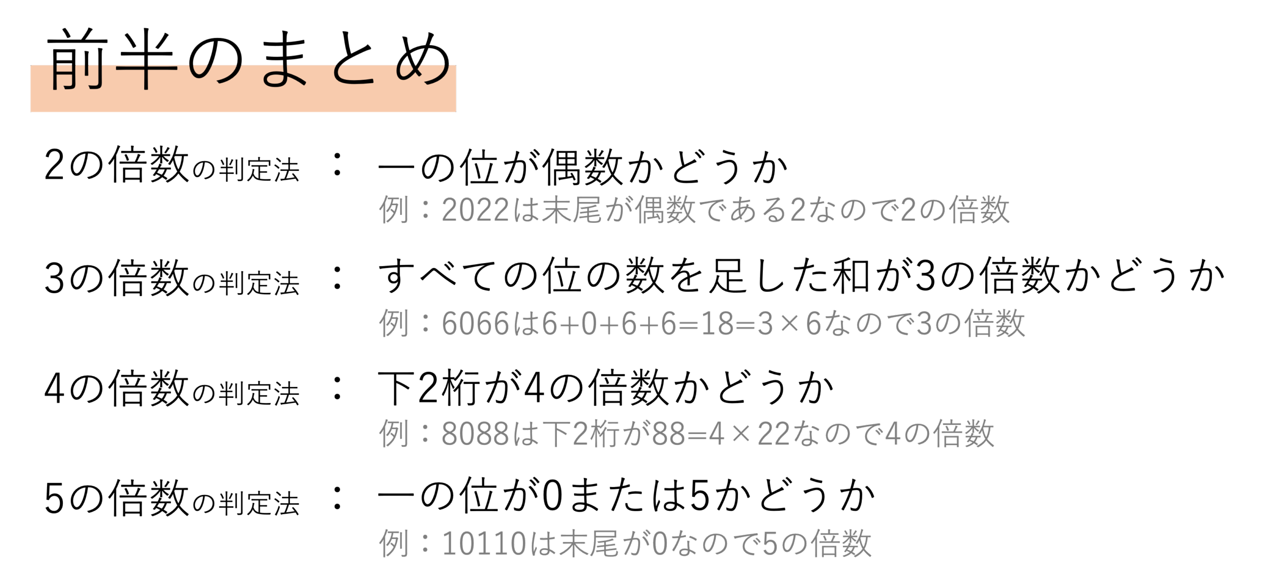 今回の記事では整数の性質に焦点を当て,とりわけ整数が何の倍数になっているかを判別する方法についてご紹介していきました。整数の性質は受験でも頻繁に出題される範囲ですし,直接聞かれなくとも,計算の中でこれらの情報を使うことで簡単に解くことができるといった問題も一定数存在します。そのため完璧に頭の中に入れるだけでなく,習慣として知識を定着させておきましょう。本記事が今後の学習のお役に立てば幸いです。