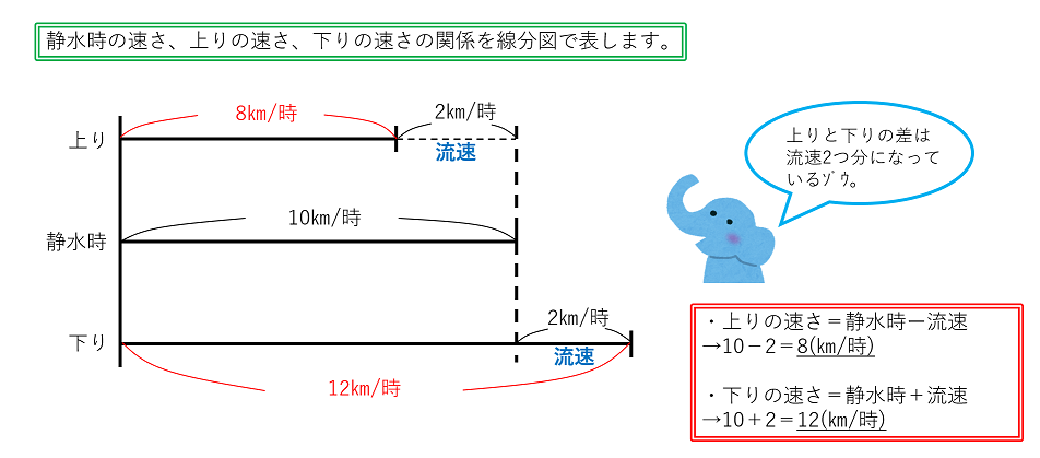 「静水時」という言葉は流水算の問題以外ではあまり使わないと思いますので、お子さんがこの言葉の意味をきちんと把握できているかどうかは最初に確認しましょう。