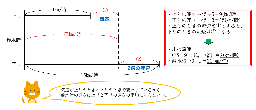 上りの速さは、45÷5=9(㎞/時)、下りの速さは、45÷3=15(㎞/時)です。ただし、川の流速は、下りのときには上りのときの2倍の速さになっているため、上りのときの流速を①、下りのときの流速を②とします。線分図より、①=(15-9)÷(①+②)=2(㎞/時)、静水時の速さは、9+2=11(㎞/時)です。