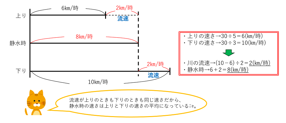 川の流速が変わらない問題では、上りと下りの速さの平均が静水時の速さになります。そのため、(6+10)÷2=8(㎞/時)としてもよいです。(ここでいう平均とは、「往復の平均の速さ」という意味ではなく、ちょうど中間の速さという意味です。)