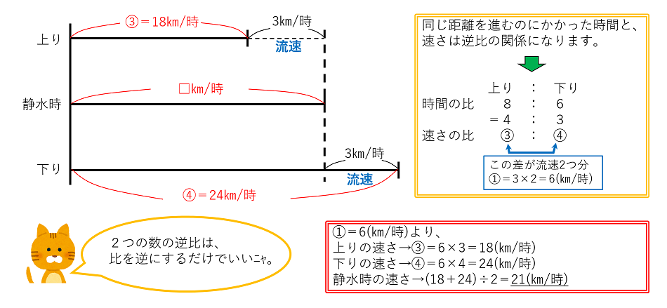 同じ距離を進むのにかかった時間と、速さは逆比の関係になります。かかった時間の比は、上り:下り=8(時間):6(時間)=4:3なので、速さの比は、上り:下り=③:④となります。この差が、流速2つ分にあたるので、①=3×2=6(㎞/時)です。