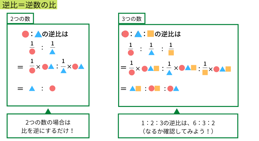 逆比とは、「逆数の比」という意味ですが、2つの数の逆比を考える場合には比を逆にするだけでよいです。もし3つ以上の数の逆比を考える場合には、逆数から考えましょう。