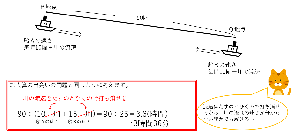 船Aの下りの速さと船Bの上りの速さの和は、流速の分を打ち消すことになるため、静水時の速さの和に等しくなります。90÷(10+川+15-川)=90÷25=3.6(時間)より、3時間36分です。