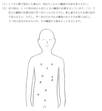 (1)はある働きをする臓器の名前を答える問題、(2)は、臓器の位置を答えさせる問題です。