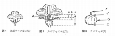 図1はカボチャのおばな、図2はカボチャのめばな、図3はカボチャの実です。図2について、めしべ全体と、めしべのうち受粉する部分はどこかを、表から選ばせる問題や、図2のAの部分は図3のどの位置になるのか、という問題が出題されました。また、