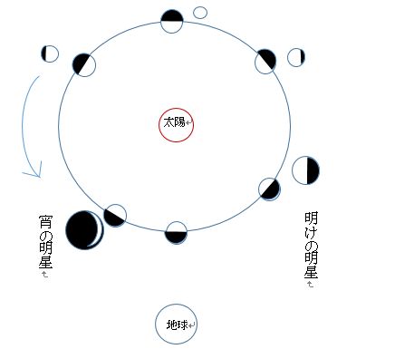 この位置がいわゆる「宵の明星」です。反対側の位置が日の出の位置ですから、4が「明けの明星」ということになります。