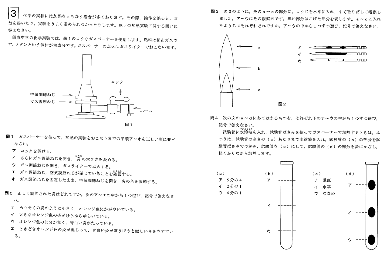 今回は開成中学の問題を題材にしましたが、これほどガスバーナーの使い方に特化した問題はそう多くないと思います。ですが、正しい知識があれば時間をかけずに正解していけますが、知識があやふやだと1問も解けない、ということになりかねず、芋づる式に失点するでしょう。