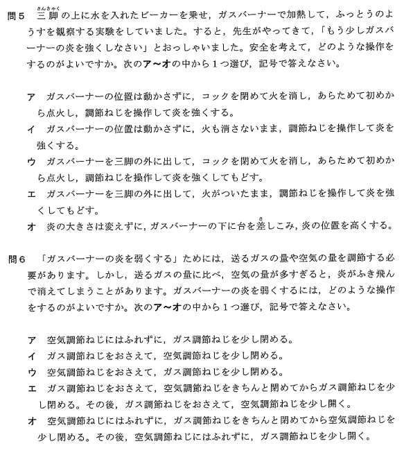 問6は、問5とは反対に、ガスバーナーの炎を弱くする方法について問う問題です。空気の量とガスの量のバランスが大切である、というヒントが問題文中にあります。これは、空気の量が多すぎると消えてしまう、ということです。このような問題文のヒントをしっかり読みとることも大事です。