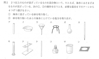 ①は、海水に混ざっている砂を取り除くのに必要な器具を選ぶ問題ですが、海水に混ざっている砂は水に溶けるものではないですから、「ろ過」することで取り除くことができますね。ろ過で使うものは何でしょうか?ろうと、ろ紙、ろうと台、ガラス棒、ビーカーです。ですから、答えは、ウ、ク、ケ、サとなるわけです。