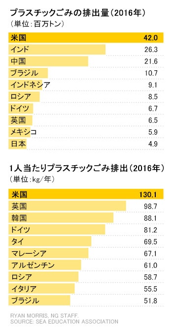 カ、一人当たりのプラスチックごみ排出量で、日本は世界の国々の中で下位である。