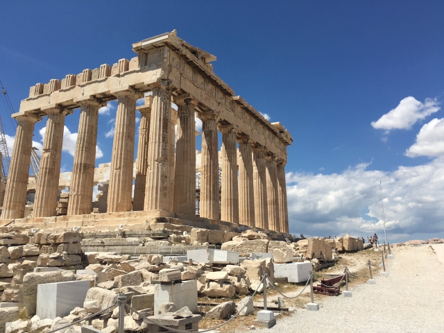 アクロポリスは、古代ギリシアのポリス(都市国家)において、アゴラ(市民の政治、経済にまたがる生活の中心をなした広場)とともに中心市の主要部を構成した小高い丘。紀元前から城壁が造られ、前5世紀後半から前4世紀初頭にかけてパルテノン、プロピライア(前門)、エレクテイオン、アテナ・ニケ神殿などが完成しました。