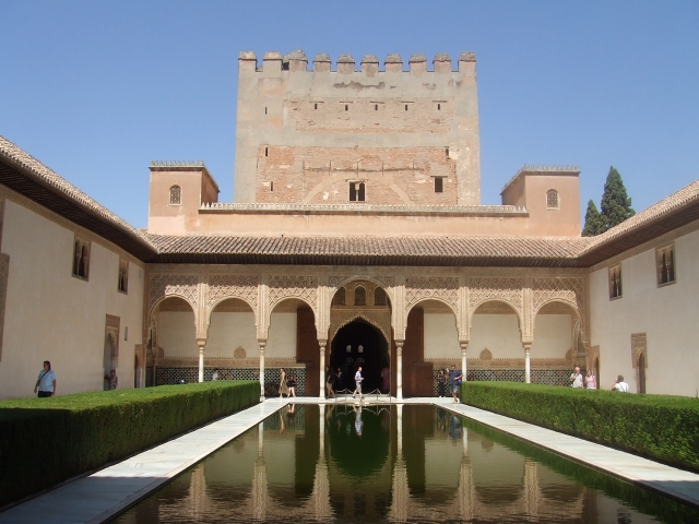 アルハンブラ宮殿は、グラナダ市街南東部の丘の上に立つ古城。13世紀にイスラム王朝であるナスル朝のアルアマール王によって建設されました。グラナダは8世紀に入植したムーア人によってつくられ、13~15世紀末までイベリア半島最後のムーア人の王朝、ナスル朝の都が置かれていました。