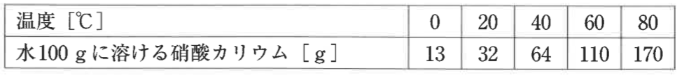 ⑵ ⑴の飽和水溶液を20℃に冷やすと、硝酸カリウムの結晶が何gできますか。