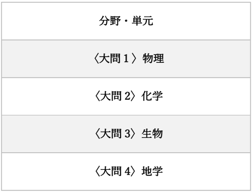 基本的には物理・化学・生物・地学の4分野からそれぞれ1問ずつ出題されており、同じ分野から複数問出題されるということはほとんどありません。