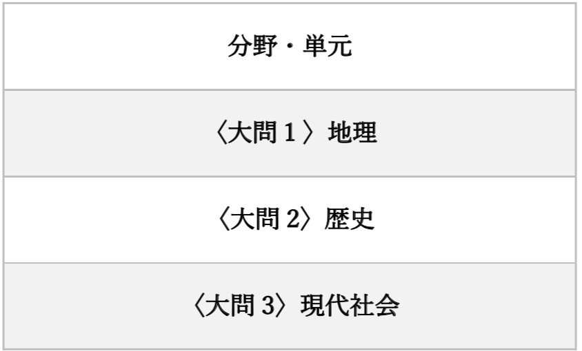 基本的には地理・歴史・現代社会(公民・時事含む)の3分野からそれぞれ1問ずつ出題されることがほとんどです。複数分野を組み合わせた融合問題のようなものは出題されていません。