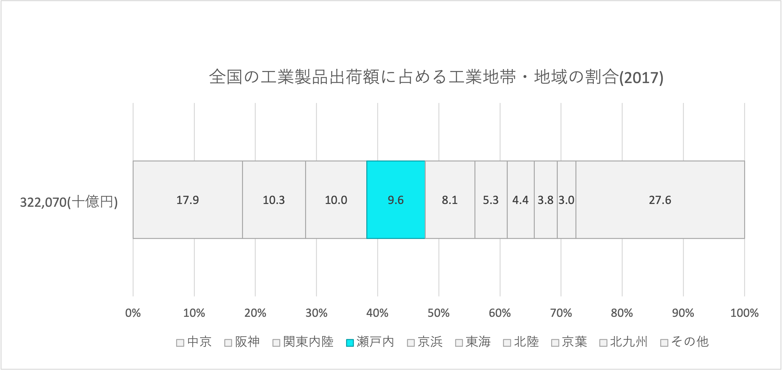 水色が瀬戸内工業地域を指します。このことから,瀬戸内工業地域は全国の工業製品出荷額のうち9.6%を占めているということがわかります。この数値は中京の17.9%・阪神の10.3%・関東内陸の10.0%に次ぐ全国第4位ですので,全国における影響力の強さをお伝えできるのではないでしょうか。