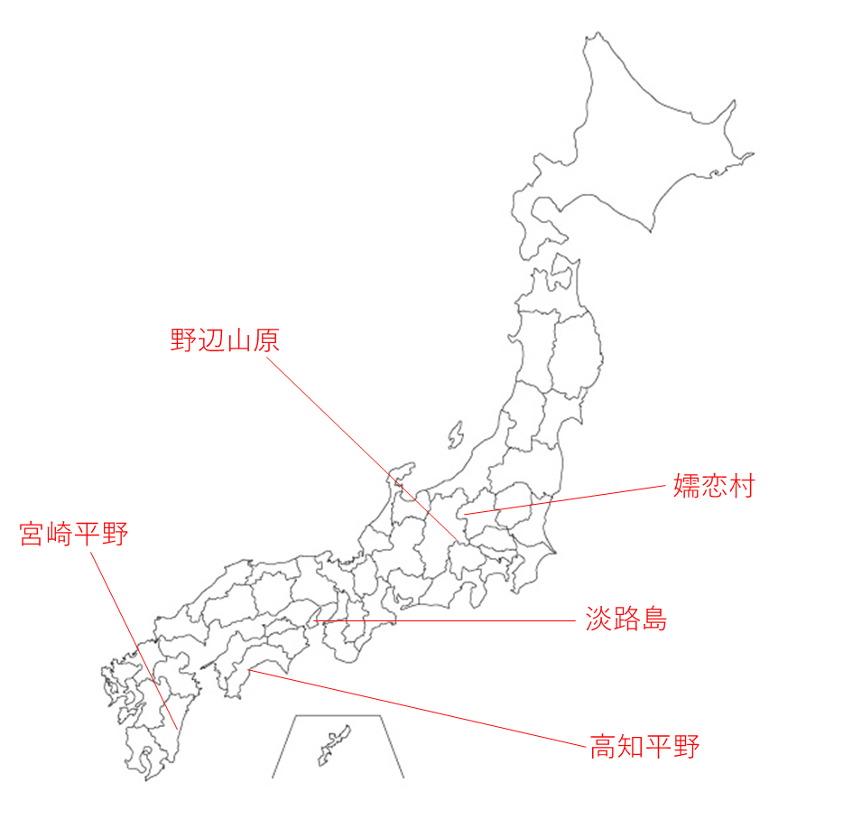 - 淡路島(あわじしま)(兵庫県)…大阪(おおさか)など近畿(きんき)地方の大都市向けに近郊農業を行っています。たまねぎの栽培で有名です。
