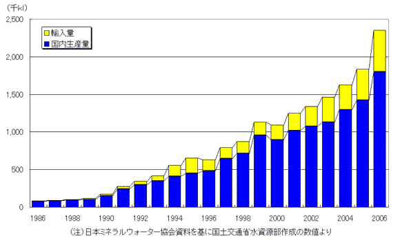 エ、2000年以降、日本では浄水場の水質が向上したため、ミネラルウォーターの生産量は減り続けている。⇨下の図をみてみましょう。2000年以降、生産量は減るどころか増加し続けています。
