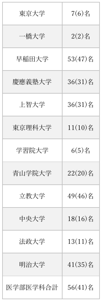 ※医学部医学科…東京医科歯科大学、信州大学、浜松医科大学、東京女子医科大学、東京医科大学、日本医科大学、北里大学、国際医療福祉大学、順天堂大学、東邦大学、帝京大学、埼玉医科大学、聖マリアンナ医科大学、獨協医科大学、日本大学、杏林大学、金沢医科大学、慶應義塾大学、昭和大学、東京慈恵会医科大学、愛知医科大学、岩手医科大学