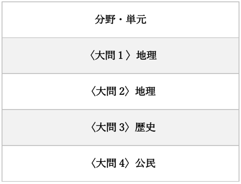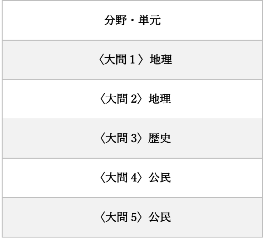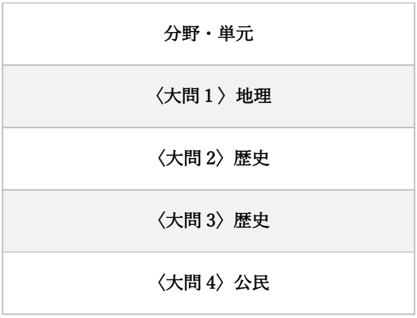 基本的には地理・歴史・公民・時事の4分野から少なくとも1問ずつ出題されていますが、同じ分野から複数問出題される場合がほとんどです。