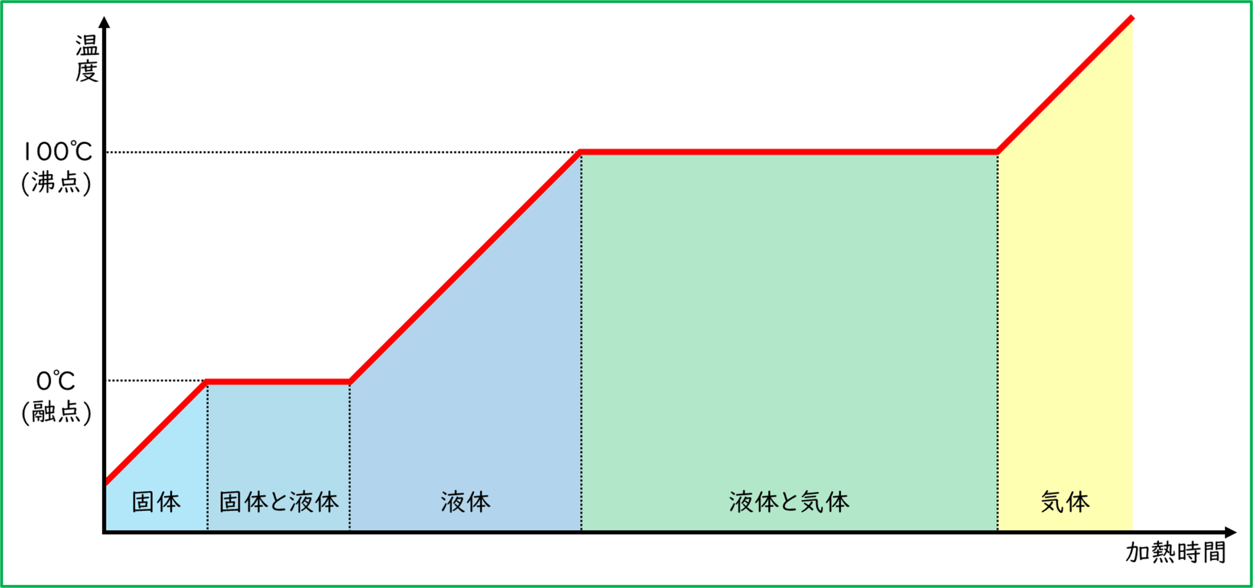まずは氷を加熱していった時の温度や状態の様子を確認しましょう。氷の状態である水を加熱していくとその温度や状態の変化は下の図のようになります。