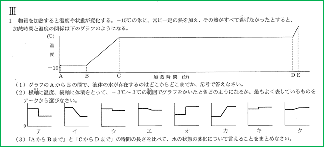 これらのことを踏まえると、-3℃から0℃までは体積が変わらず、0℃になると温度が変化しないまま体積がほんの少し小さくなり、再び0℃から3℃まで体積が変わっていない「ウ」のグラフが正解です。