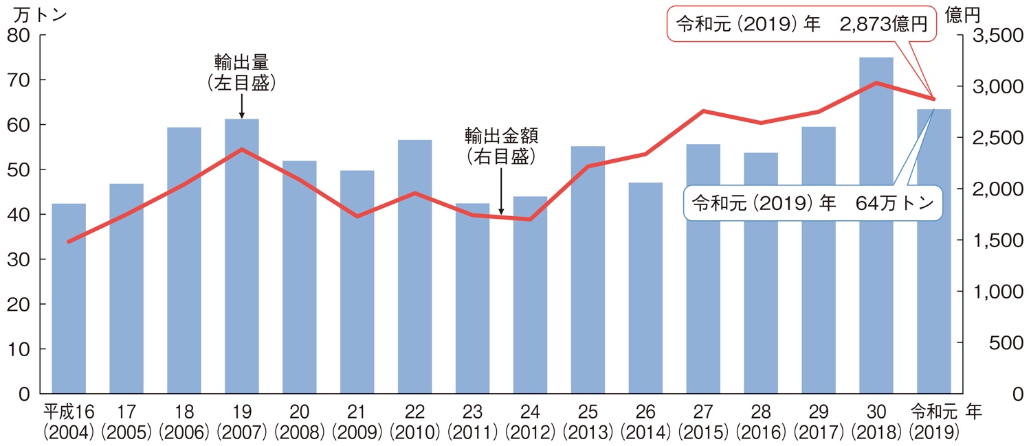 生産量の多いホタテガイやブリは近年輸出がさかんに行われています。日本の水産業の輸出と輸入について今度は見ていきましょう。