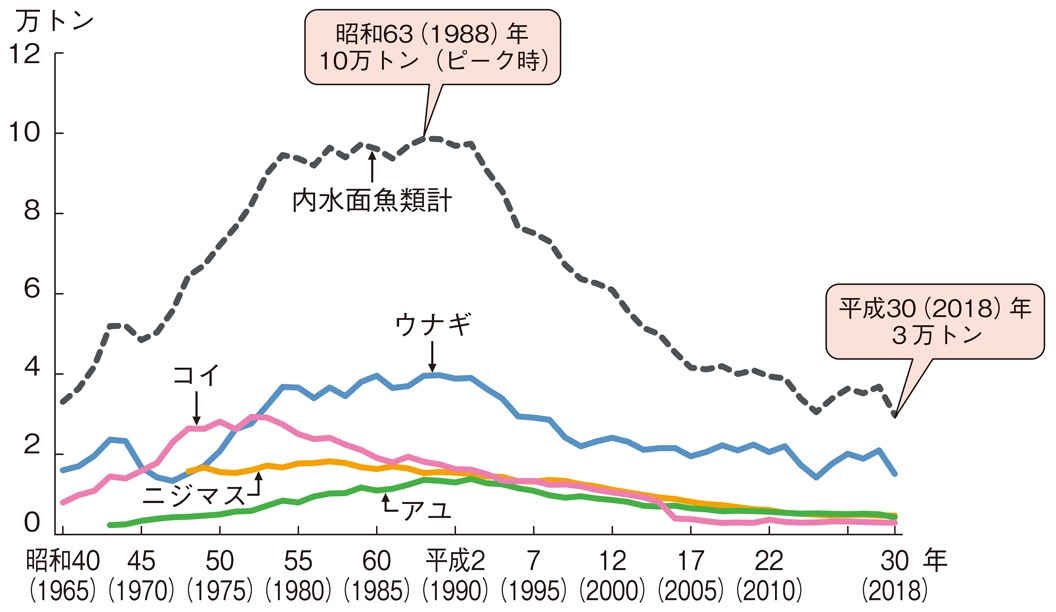 - 平成13(2001)年以降の内水面養殖業生産量は、マス類、アユ、コイ及びウナギの4魚種の収獲量であり、平成19(2007)年以降の収獲量は、琵琶湖、霞ヶ浦及び北浦において養殖された上記4魚種以外のその他の収獲量を含む。