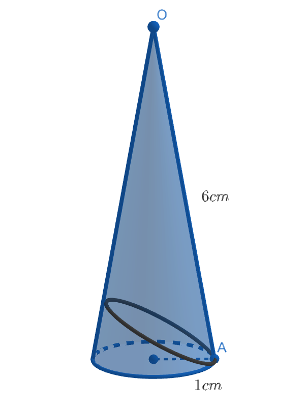 母線の長さが6cm,底面の半径が1cmである円すいに,底面の周上の1点を通るように図のようなひもを巻き付けました。ひもの長さが最も短くなるとき,ひもの長さは何cmですか。