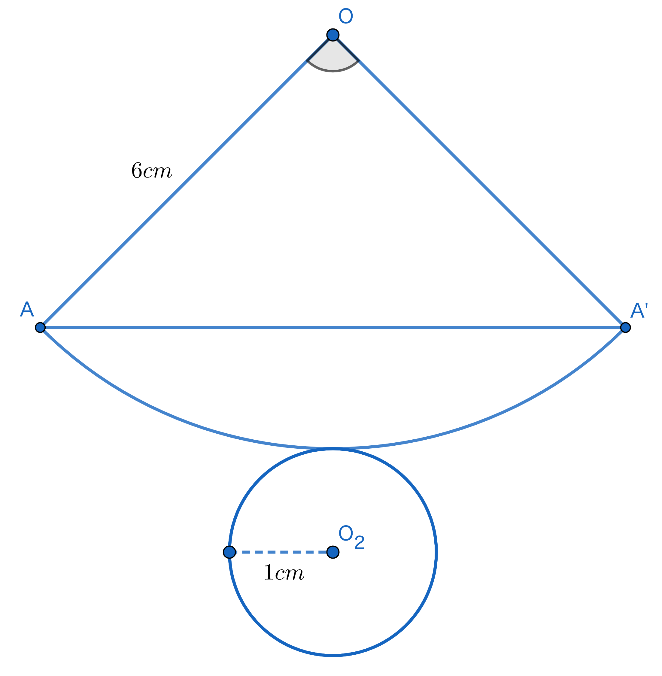 これより三角形OAA’は頂角が60°の二等辺三角形,つまりは正三角形だと分かりました。よってOA=OA’=AA’=6cmとなります。したがって最小になるひもの長さは6cmです。