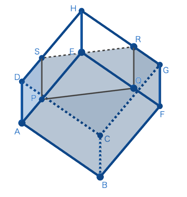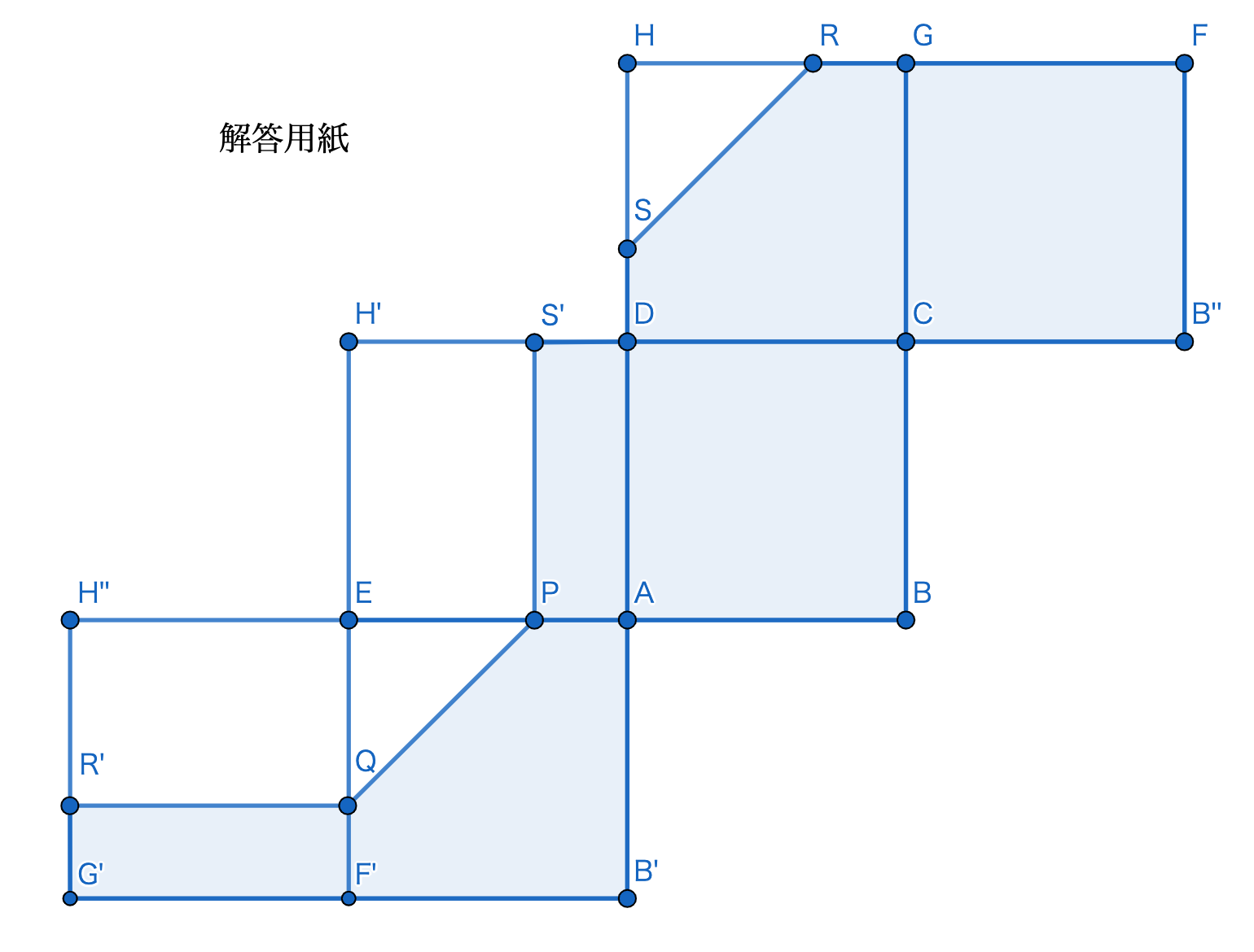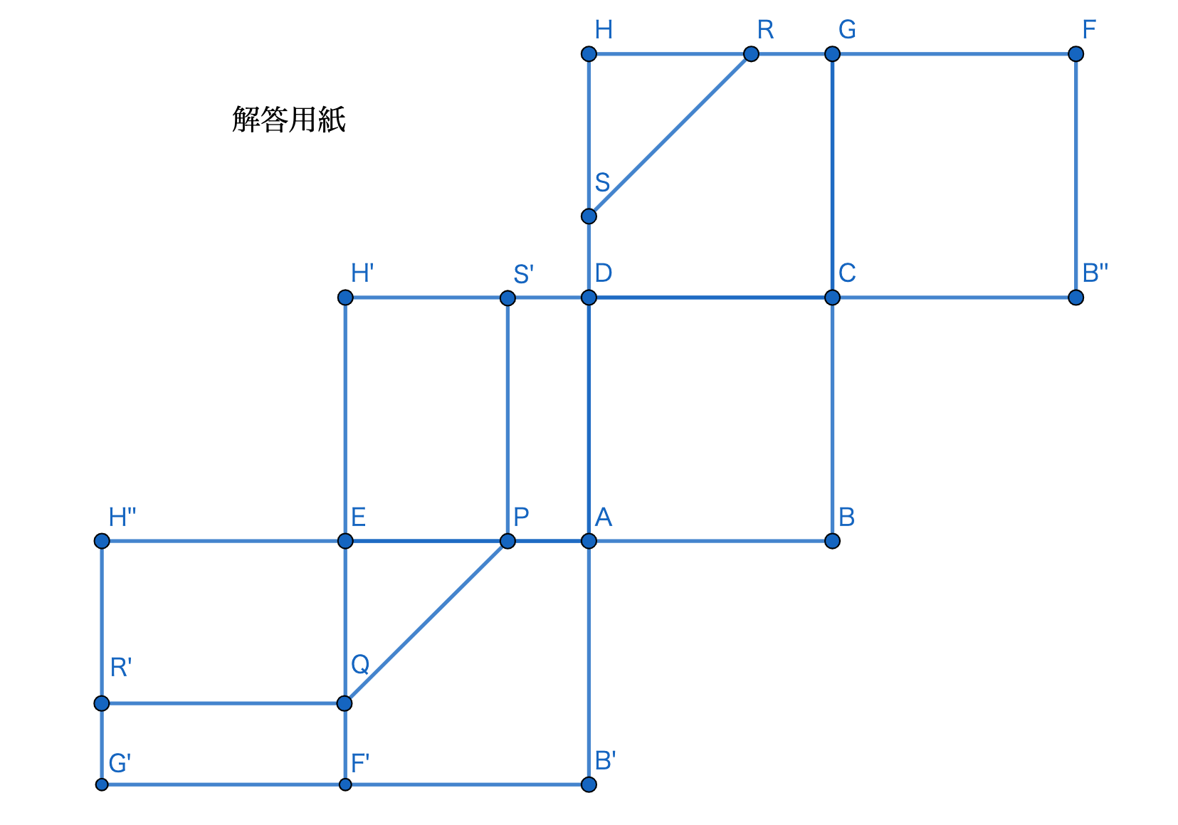 そうして書き込んだ展開図に,面PQRSを構成する部分をさらに書き込む必要があります。点Pから順番に図に表していきましょう。点Pは辺AE上にあり,AP=6cmを満たします。したがってこの指示通りの位置に点Aの隣に新たな点を打てばいいことがわかります。これと同様に点Q・R・Sも書き込み,問題で示されているように繋いでいくことで,面PQRSも展開図に表せました。このとき点Rと点Sだけは2箇所に書き込むことになり,不安に思うかもしれませんが,これは辺DH・辺GDに沿って展開されているために起こることなので,気にせず書き込んで下さい。