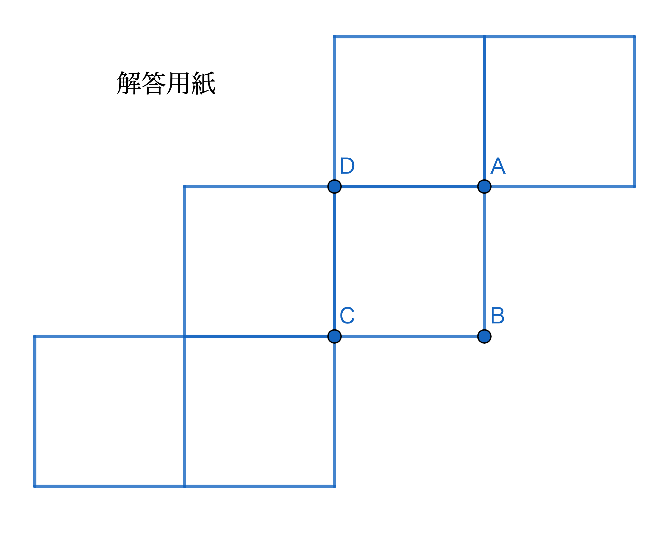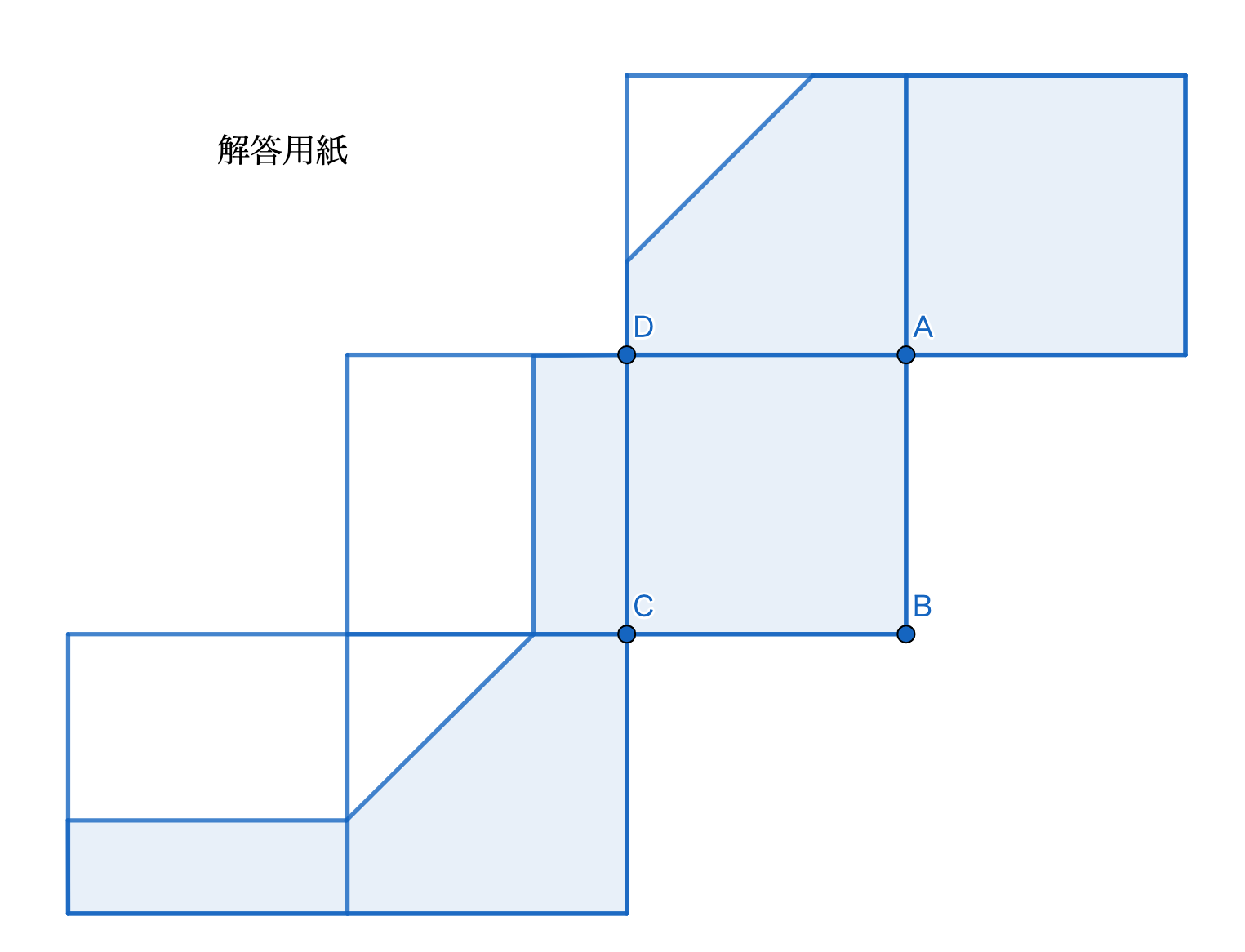 残りの作業はこの展開図のうち水と触れている部分を塗るだけです。水と触れている部分はあらかじめ問題の中で青く塗りつぶされています。よって立体を見て,当てはまる平面を塗りつぶしていけばよい,と見通しが立てられ,この通りに塗りつぶしていくと答えは次のようになります。このとき点を書き表す必要はありませんが,分かりやすいように点ありのものと点なしのものを載せておきます。