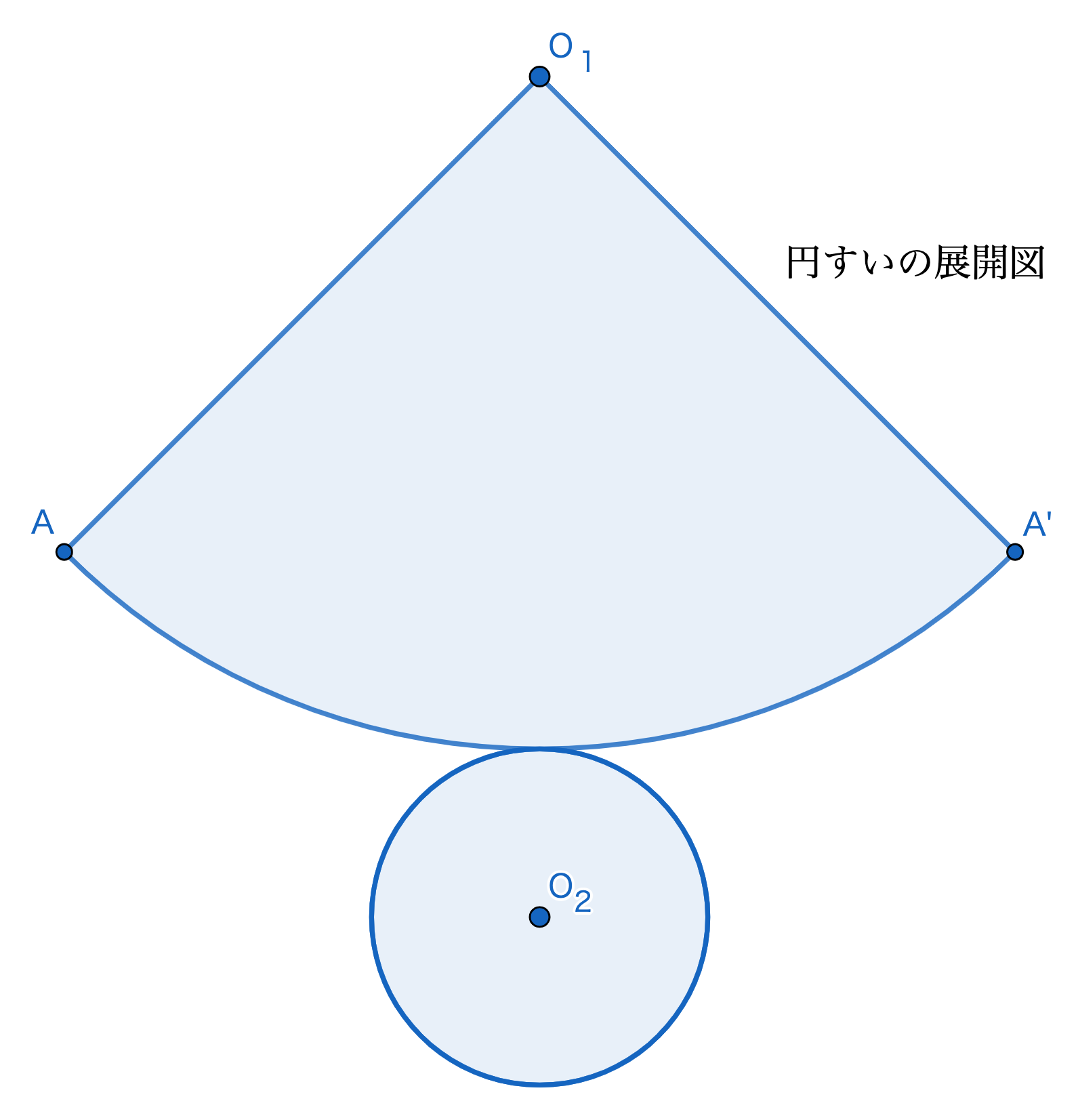 それでは解説に移ります。ひもを側面に巻きつけているため,一度立体を平面上に展開することで簡単に考えることができそうだ,と見通しが立てられます。ここでは母線OAと底面の演習に沿って切り取ります。出来上がる図形は上で紹介したものと同じです。ここで基本の展開を覚えておくことが活きてきますね。