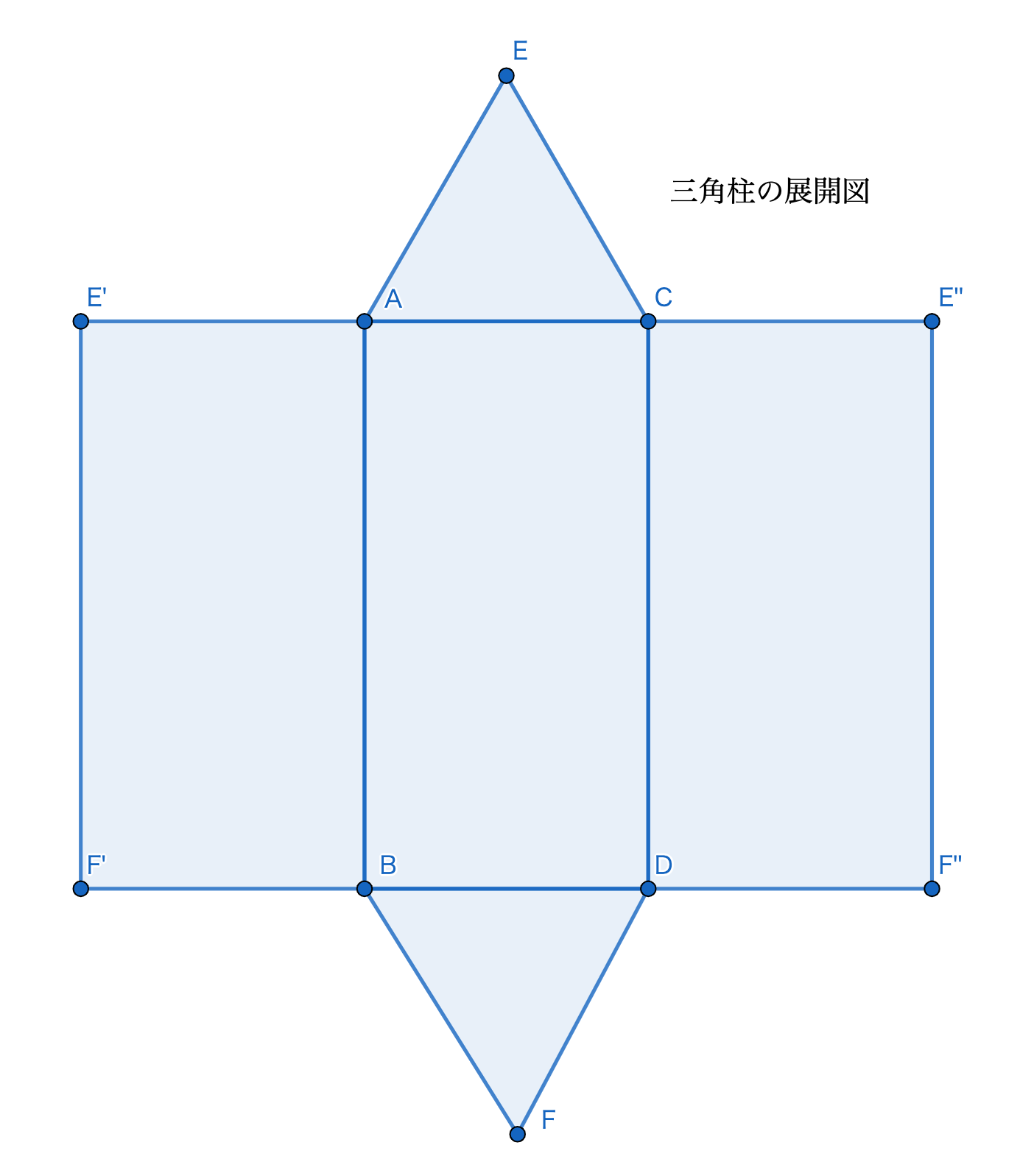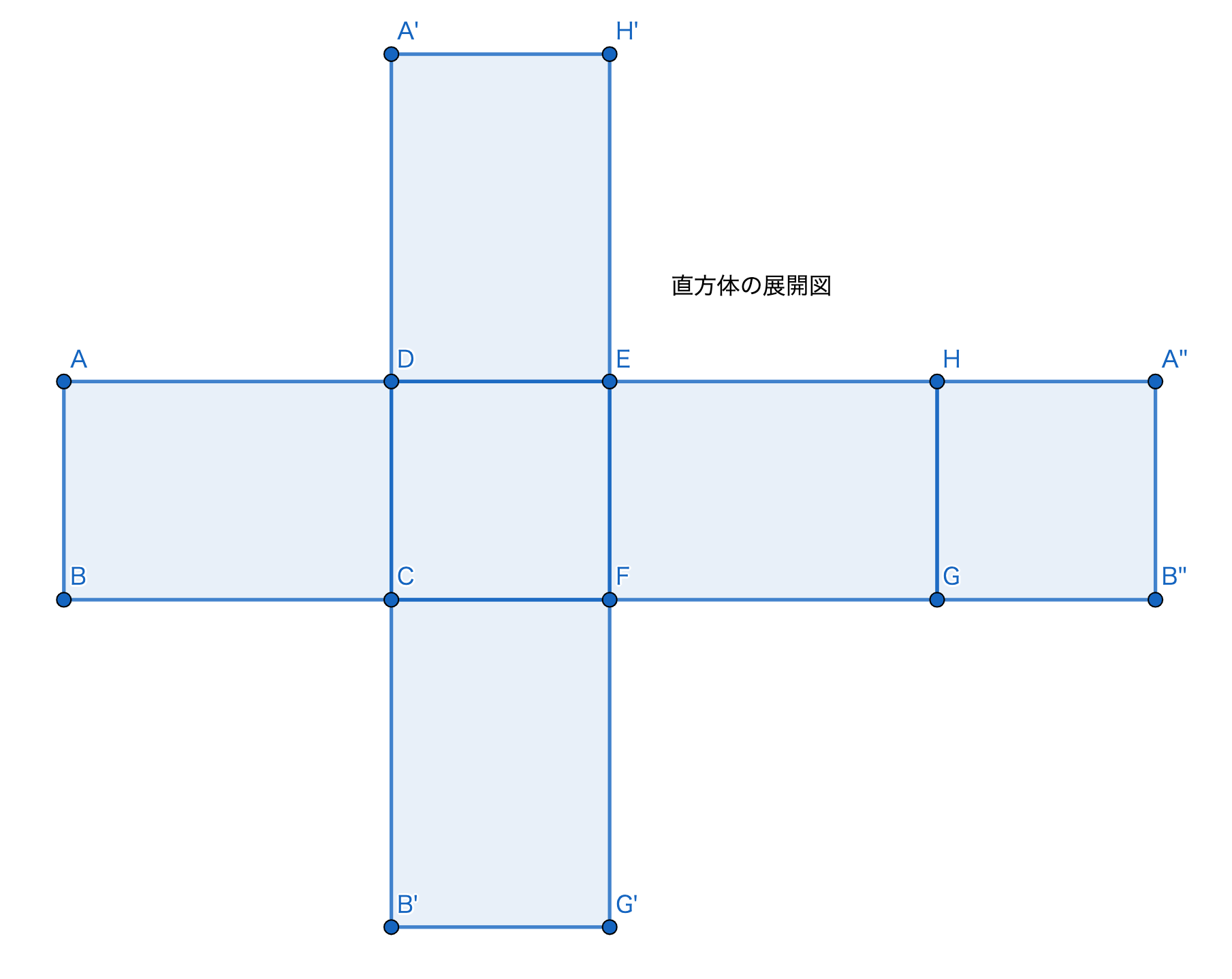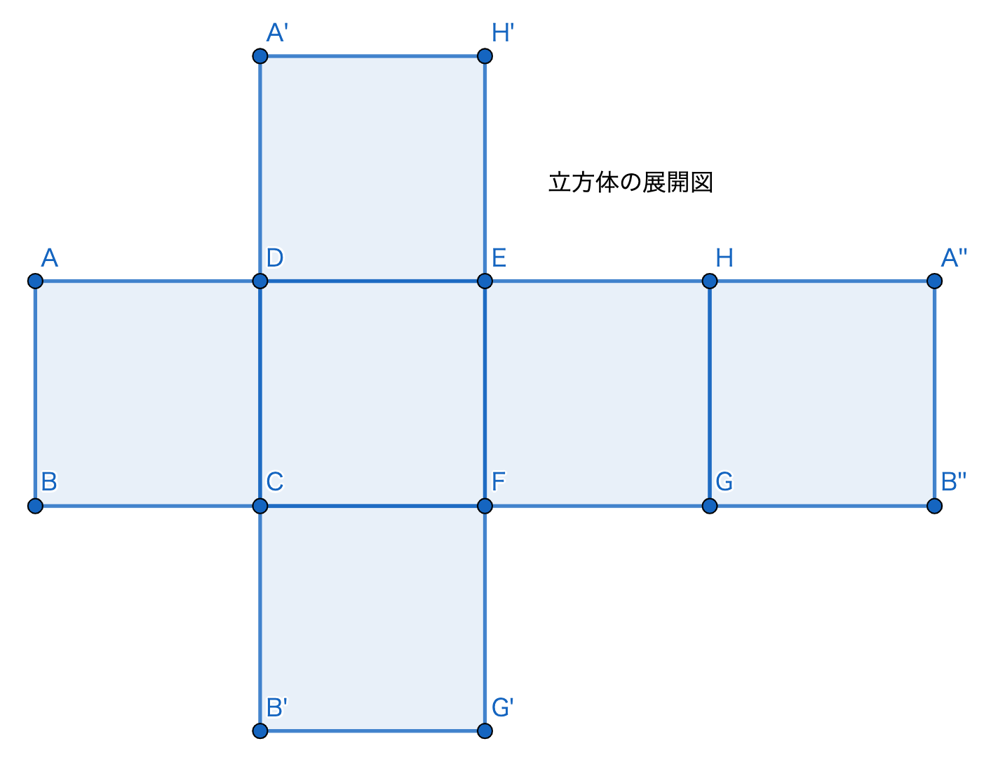 以下ではいくつかの代表的な立体の展開図をご紹介します。このとき頂点と頂点の位置関係に気をつけておきましょう。ダッシュ(「’」「”」のこと)で示された点は,組み立てたときにダッシュ無しの点と重なることを指します。下の問題を解くときにこの展開図を参考にしてみてもいいでしょう。