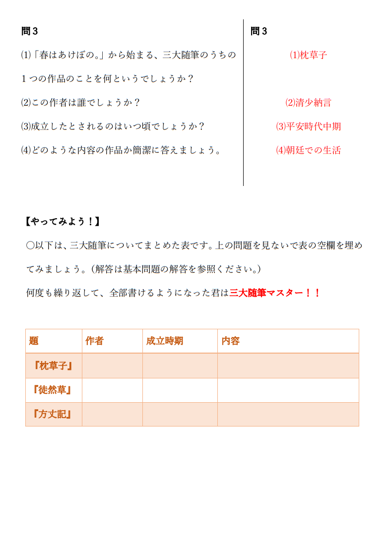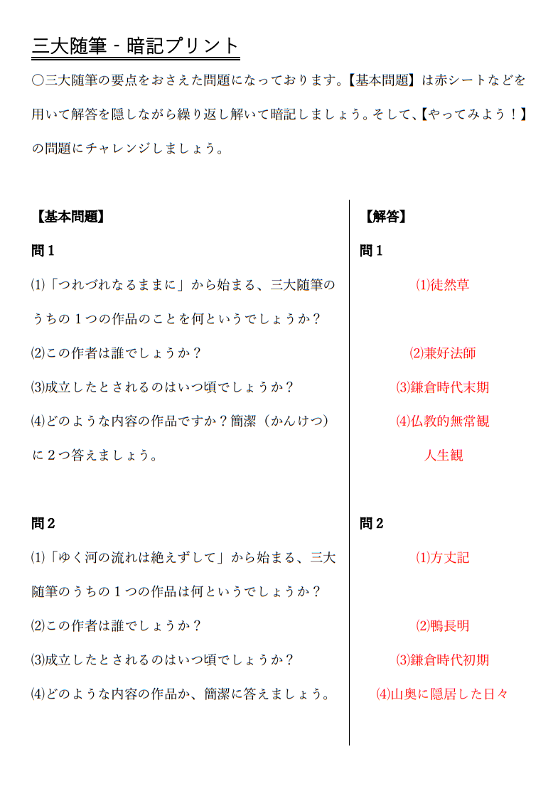 三大随筆(枕草子、方丈記、徒然草)の特徴とは?おさえておくべきポイント紹介‐暗記用プリント【無料】