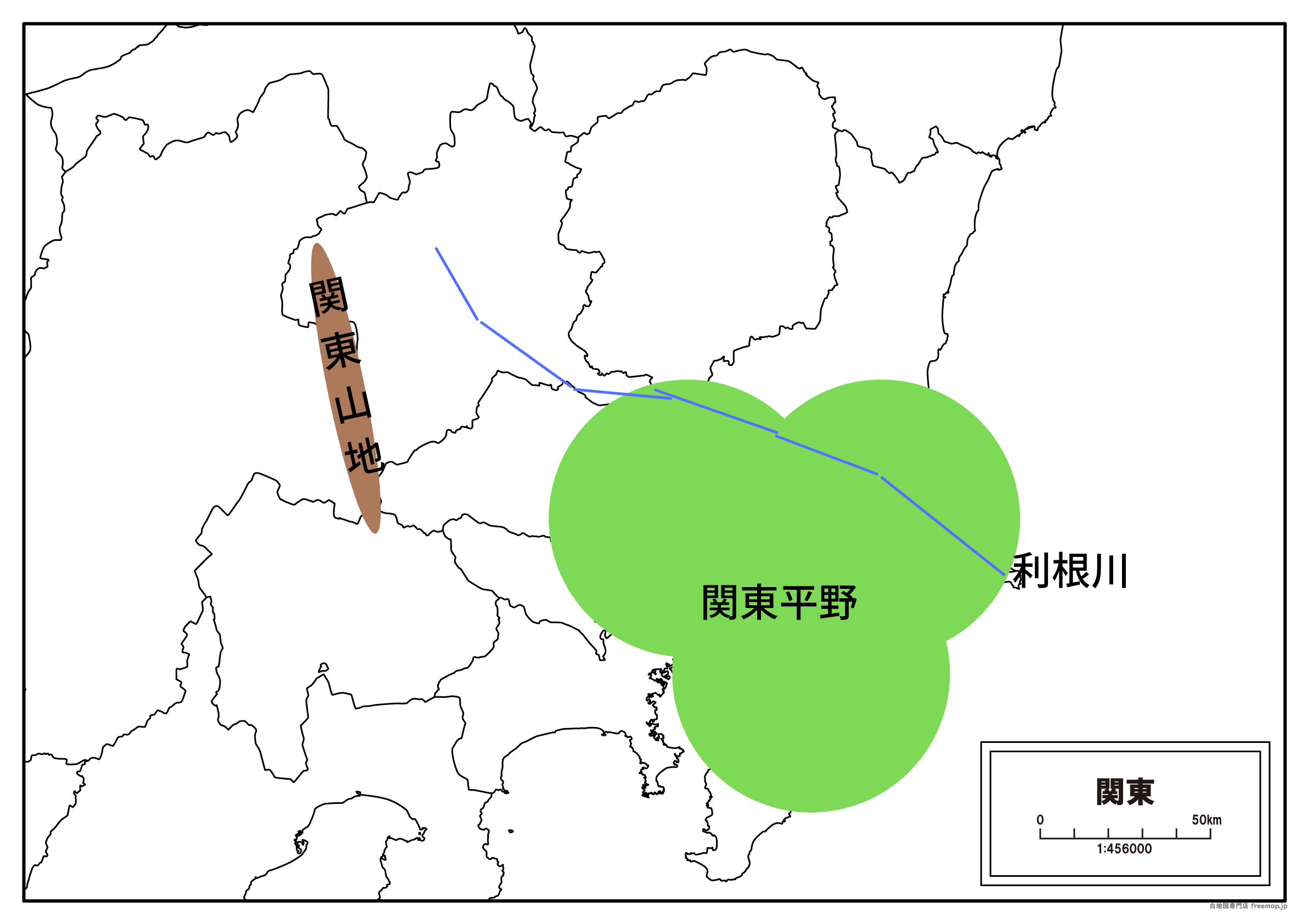 - 関東平野…日本最大の平野であり、丘陵、台地、低地からなります。利根川とその支流によって運ばれてきた大地と、関東ローム層からなる洪積台地が特徴です。