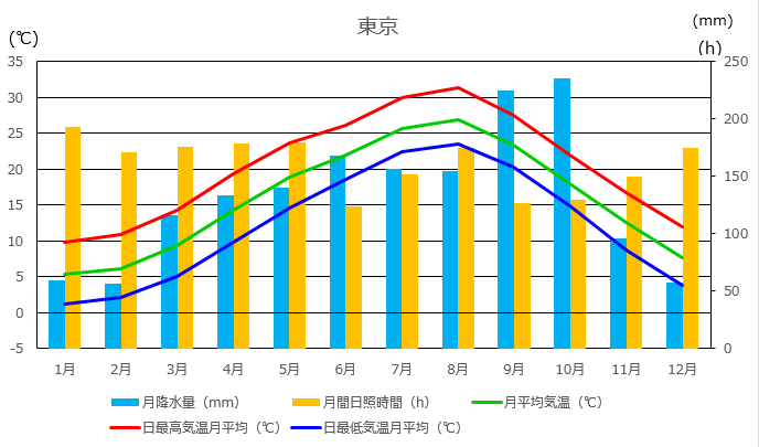 気候 | 夏は湿気が多く、冬は乾燥。夏と冬の気温差が大きい。夏場は都市部を中心にヒートアイランド現象が起きたり、ゲリラ豪雨が起きたりする。 |