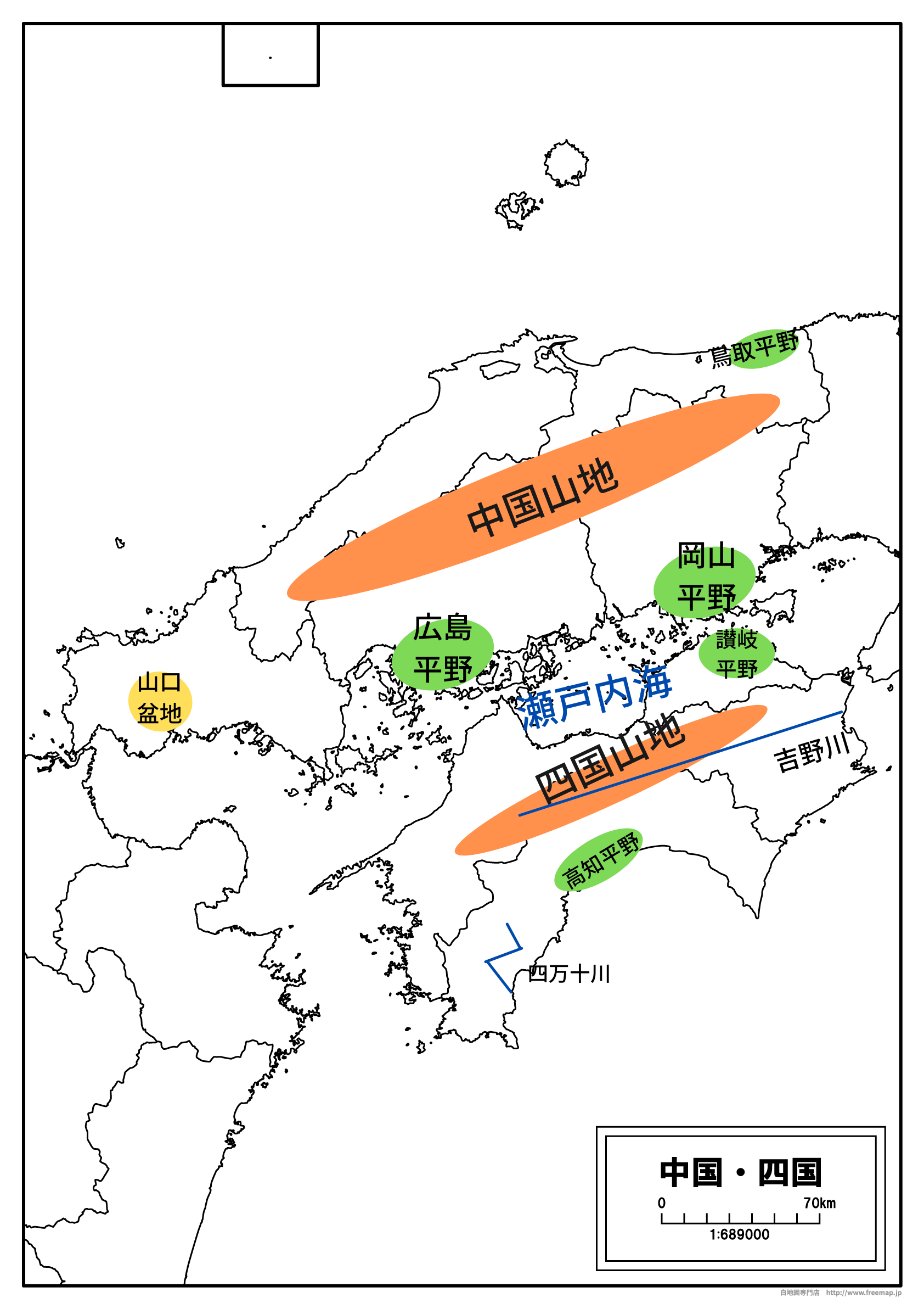 鳥取県、島根県、岡山県、広島県、山口県、愛媛県、香川県、徳島県、高知県の9県からなる中国・四国地方の地形・気候・産業などをおさえていきたいと思います。政令指定都市は、岡山県岡山市、広島県広島市の2市です。