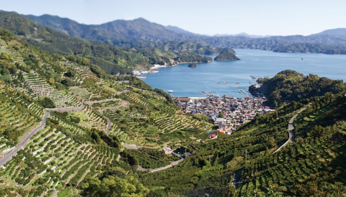 みかんの生産量が多い、愛媛県では山の斜面を利用した段々畑での生産が有名です。宇和島など南伊予地域で多く見られる段々畑は直射日光や反射を活用し、3つの太陽で温めることで糖度の高い美味しいみかんを生産しています。