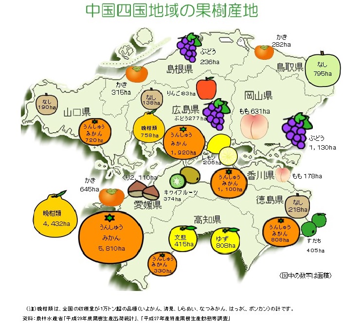 中国・四国地域では、温暖な気候を生かし野菜の促成栽培のほか、かんきつ類を中心に、果樹の生産が有名です。主な生産地と果物についてみていきましょう。