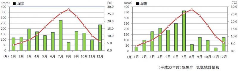 日本海式気候の山陰地方は梅雨と冬の時期に降水量が多い傾向があり、山陽の瀬戸内式気候では年間を通して降水量が少ないですが、梅雨前線による局部的な集中豪雨にみまわれることもあります。