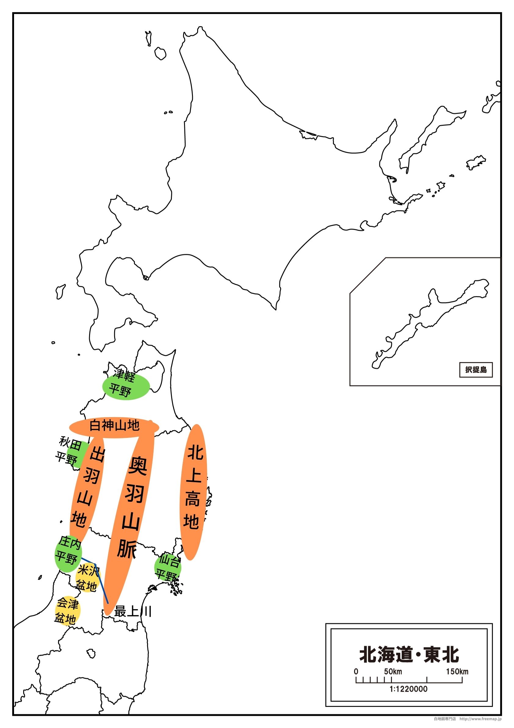 - 北上高地…東北地方北東部にある山地。青森県から岩手県、宮城県までまたがっています。