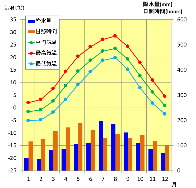 このグラフから見ても分かるように日本海側は降雪量が多く、太平洋側は日照時間が長くなります。シベリアからきた冷風が山脈にぶつかり、大雪を降らし太平洋側へと抜けていくため日本海側では降雪量や降水量が多くなります。