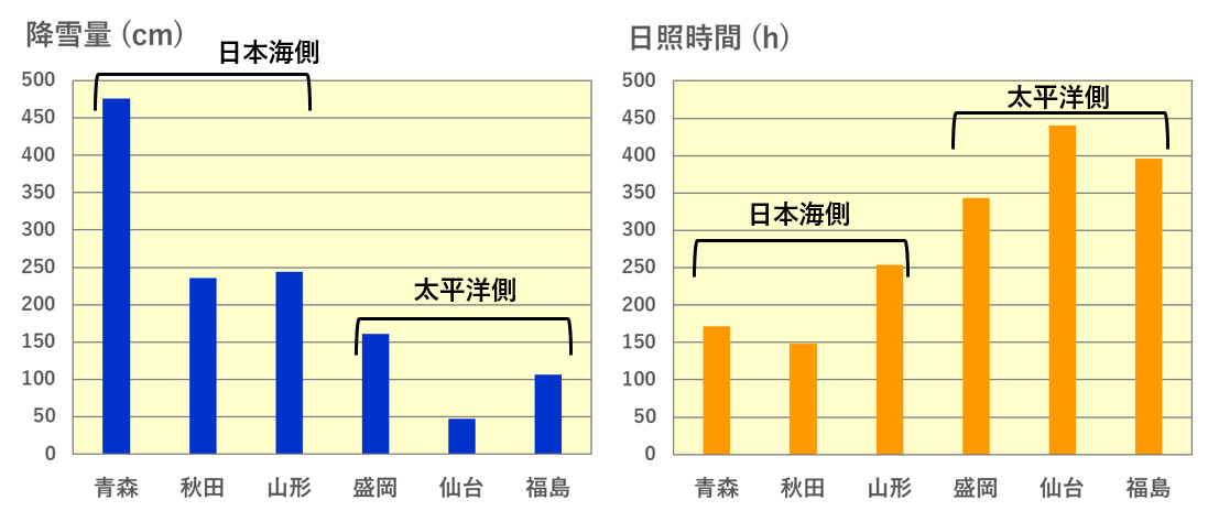見比べてみると特に冬に大きな違いがあることが分かります。日本海側は冬の降水量が太平洋側に比べて多くなり、日照時間よりも降水量が多いことから晴れの日が少ないことが分かります。一方太平洋側の冬は降水量より日照時間の方が多いため晴れの日が多いことが分かります。