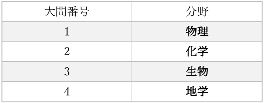 基本的には物理・化学・生物・地学の4分野からそれぞれ1問ずつ出題されており、同じ分野から複数問出題されるということはほとんどありません。