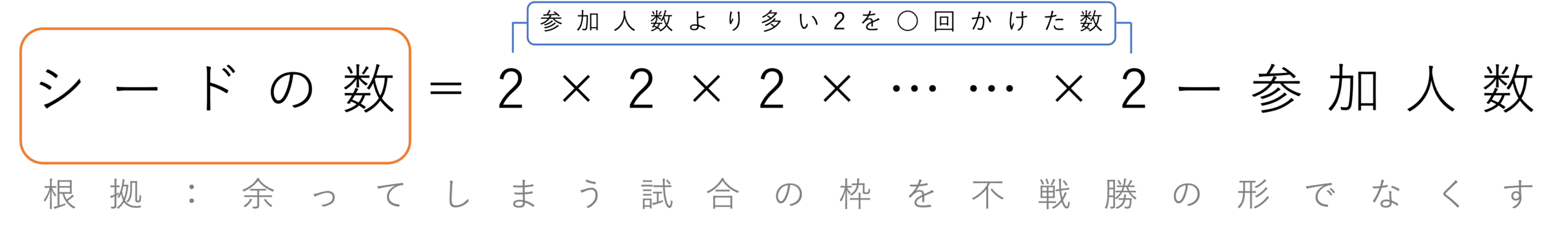 先ほど説明したように,大前提としてシードを作らないときの参加者の人数は2を優勝までの試合数の分だけかけた値になります。このことから,2を優勝までの試合数の分だけかけ算した値がシードのいないときの参加人数になる,という逆の関係も成立すると言えますね。ここで2を何回かかけた数というのは2,4,8,16,32,……となりますが,当然のことながら色々な大会の参加人数がこれらの数になるとは限りません。このような場合トーナメントでは,はじめに参加人数よりも大きな,2を○回かけた数を用意します。例えば参加人数が5人だった場合,先ほど挙げた2,4,8,16,32,……という数の中で5よりも大きな数である8という数を用意する,と言ったような感じです。