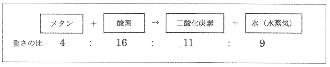 メタン:酸素=1:4の比率で燃焼し、燃焼後の重さは変わらない。