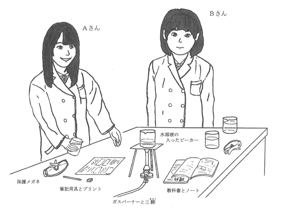 〔1〕下の図では、AさんとBさんが実験を行なっています。各問いに答えなさい。